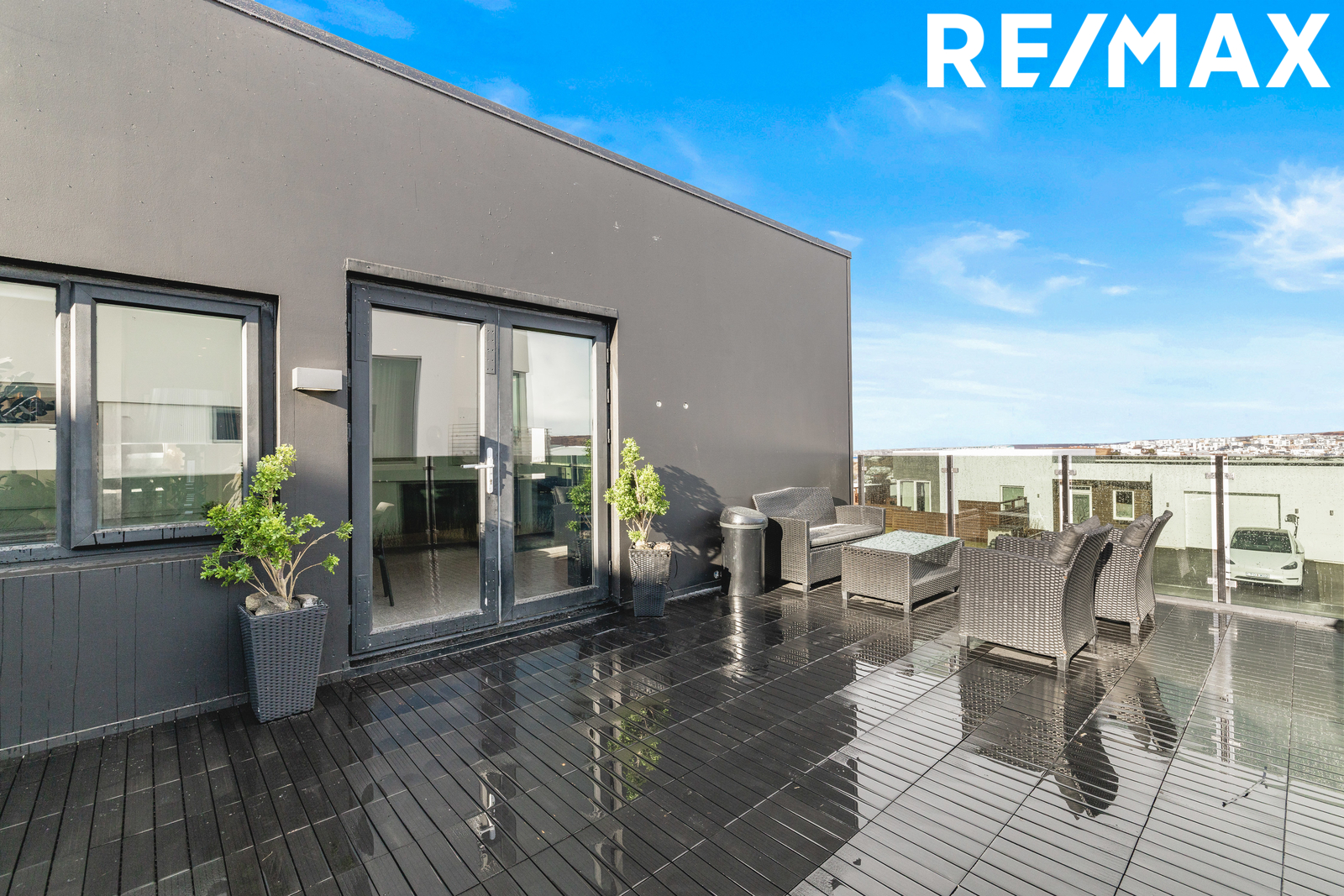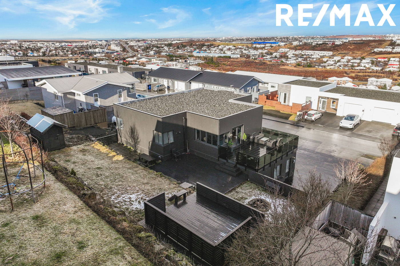 Húsið skiptist í hjónaherbergi með fataherbergi, fjögur rúmgóð barnaherbergi og fallegt baðherbergi með sturtu og frístandandi baðkari, þvottahús, stofu, skrifstofu, borðstofu og eldhús í opnu alrými, anddyri, gestasalerni og innbyggðan bílskúr. Verönd með skjólveggjum þar sem gert er ráð fyrir heitum potti, svalir frá borðstofu. Auka íbúð með sér inngangi á neðri hæð með tveimur svefnherbergjum, baðherbergi og samliggjandi eldhúsi og stofu.