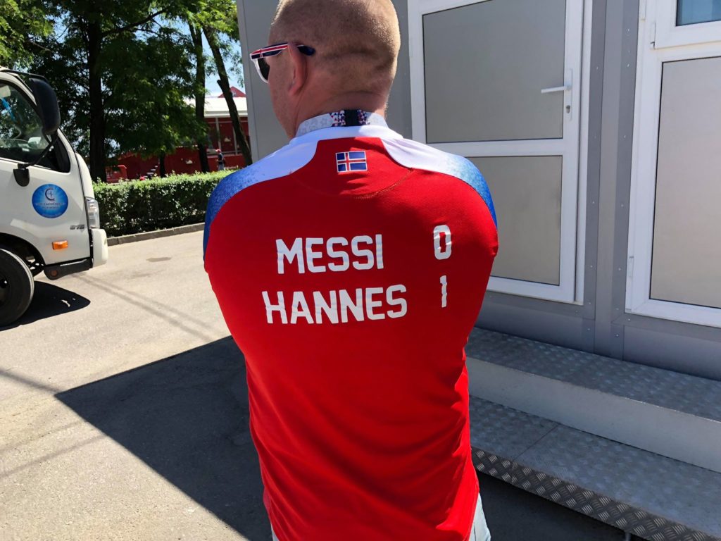 Bláa hafið er allsráðandi í Volgograd fyrir leik Nígeríu og Íslands. Ein helrauð markvarðatreyja stakk þó í stúf við aðrar og ekki síst fyrir áletrunina: „Messi 0, Hannes 1″. Eigandi treyjarinnar, Eyjamaðurinn Ólafur Guðlaugsson, var kátur í stuttu spjalli við blaðamann 433.is: „Ég fékk þessa rjúkandi úr prenti í gær,“ sagði Ólafur og staðfesti hið augljósa, að afrek Hannesar Halldórssonar er hann varði vítaspyrnuna gegn Messi yrði honum ofarlega í huga um ókomna tíð. „Hannes er minn maður. Marverðirnir eru vanmetnir. Ég kem frá Eyjum og við höfum átt frábæra markverði og kunnum að meta þá,“ sagði Ólafur og þuldi upp meistara eins Pál Pálmason, Friðrik Friðriksson og Birki Kristinsson.