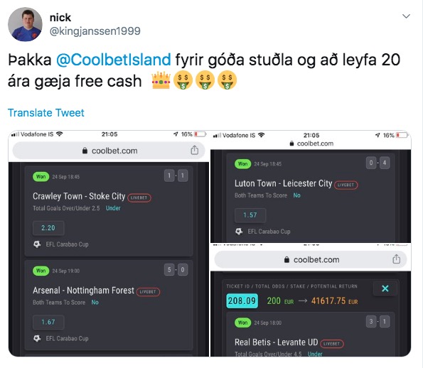 Nick Gísli Janssen, tvítugur piltur vann í gær tæpar 6 milljónir króna á erlendri veðmálasíðu. Nick setti færslu þess efnis á Twitter.