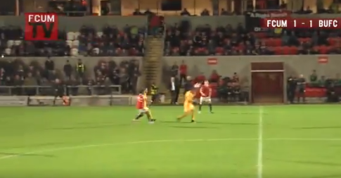Markvörður United FC misreiknaði flug boltanns verulega og endaði hann í netinu.