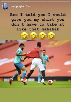 ,,Ég sagði þér að ég myndi gefa þér treyjuna mína, þú þarft ekki að taka hana svona hahaha,“ skrifaði Pogba.