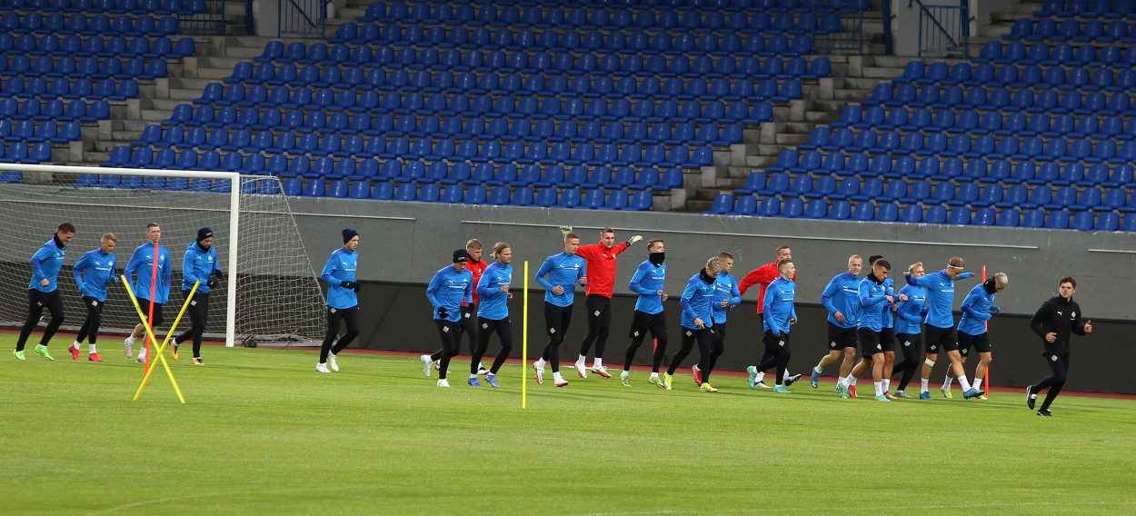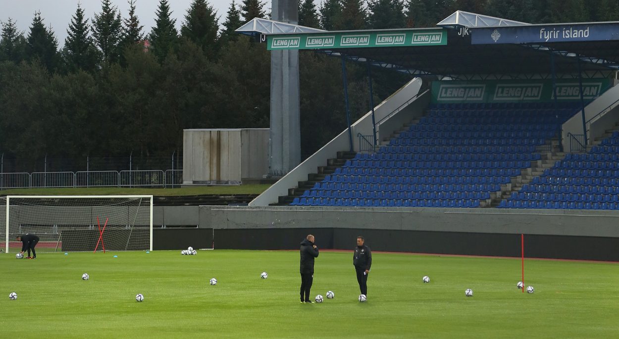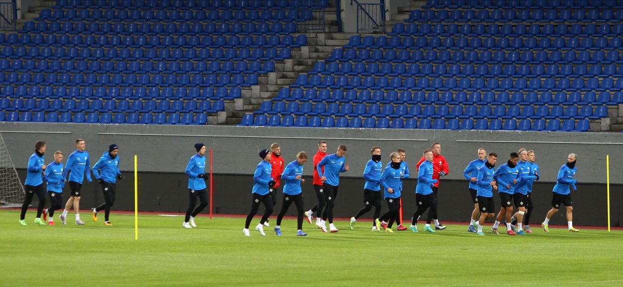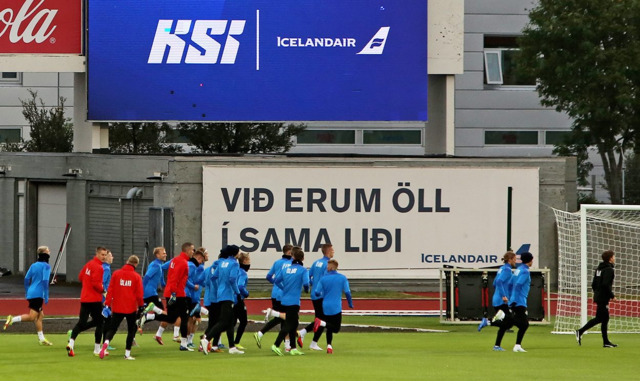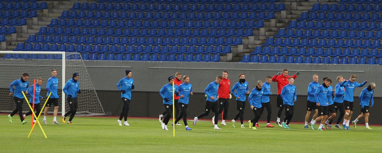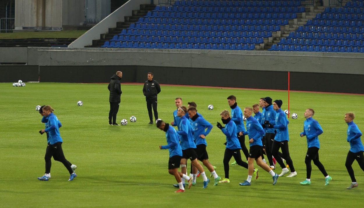 Íslenska landsliðið kom saman til æfinga í Laugardalnum í gær þar sem Arnar Þór Viðarsson og Eiður Smári Guðjohnsen reyna nú að gíra mannskapinn upp í þrjá mikilvæga leiki í undankeppni HM. Liðið mætir Rúmeníu á fimmtudag, Norður-Makedóníu á sunnudag og svo er heimaleikur gegn Þýskalandi í næstu viku.