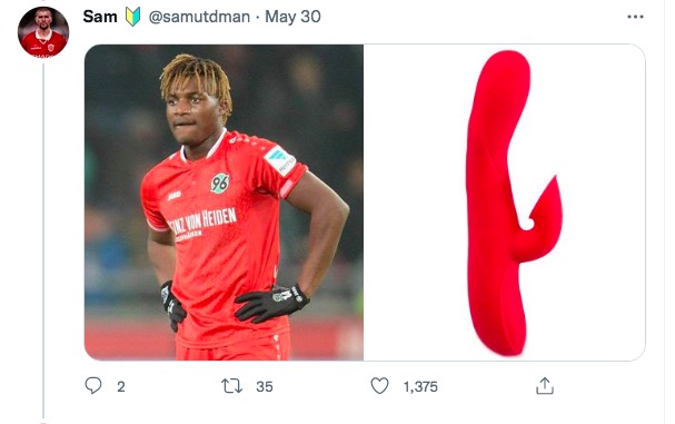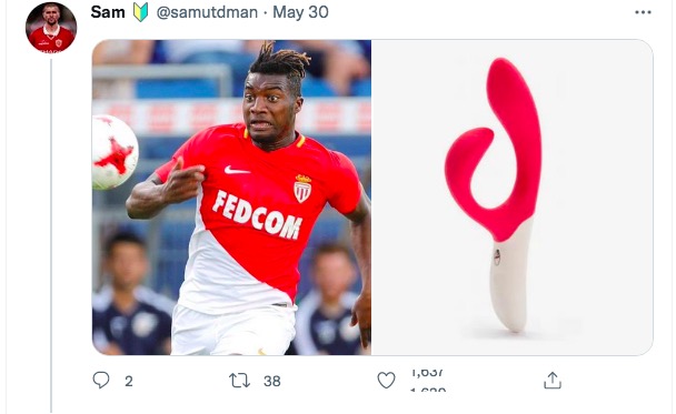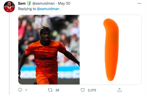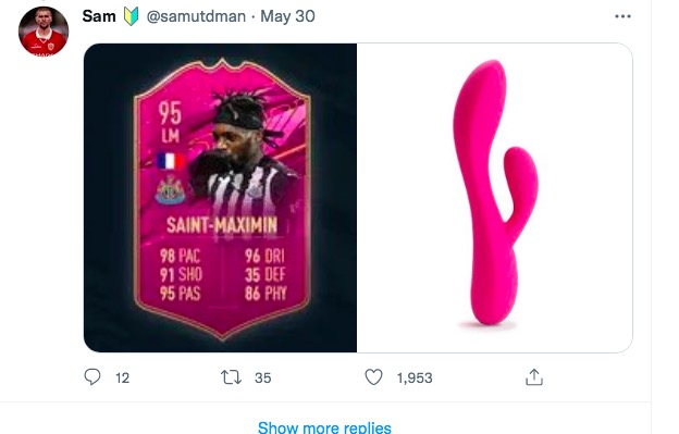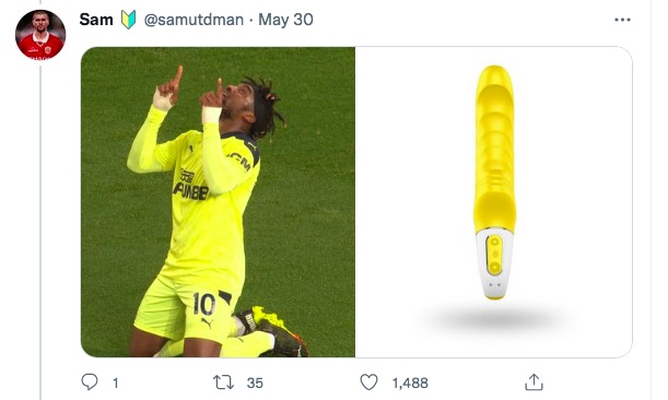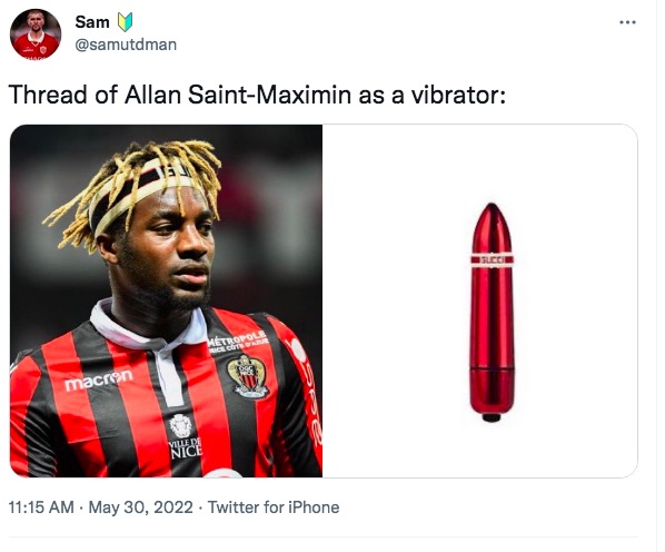 Hress Twitter notandi tók saman fjölda af myndum af Saint Maximin og líkti honum svo við kynlífstæki í svipuðum lit.