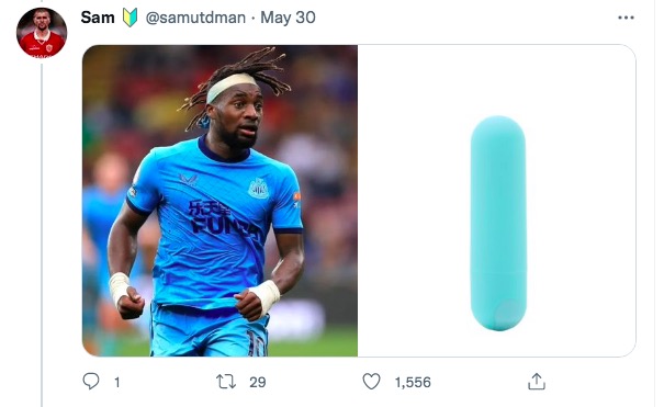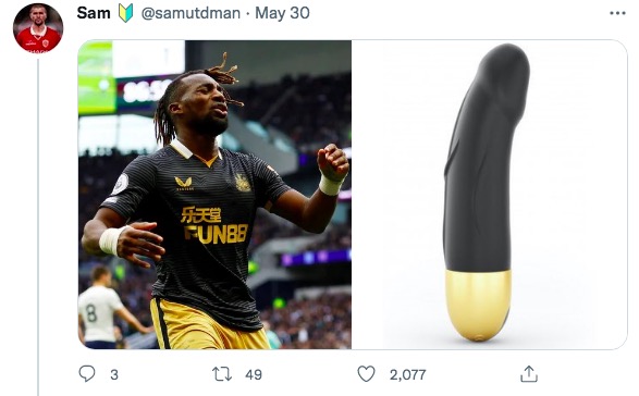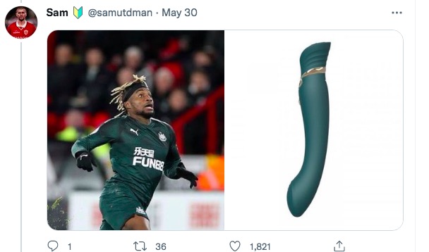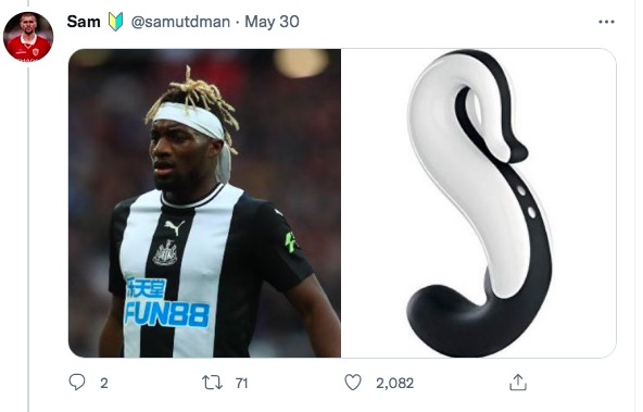 „Skemmtun innan sem utan vallar,“ skrifar Allan Saint Maximin leikmaður Newcastle við þráð á Twitter þar sem honum er líkt við hin ýmsu kynlífstæki.