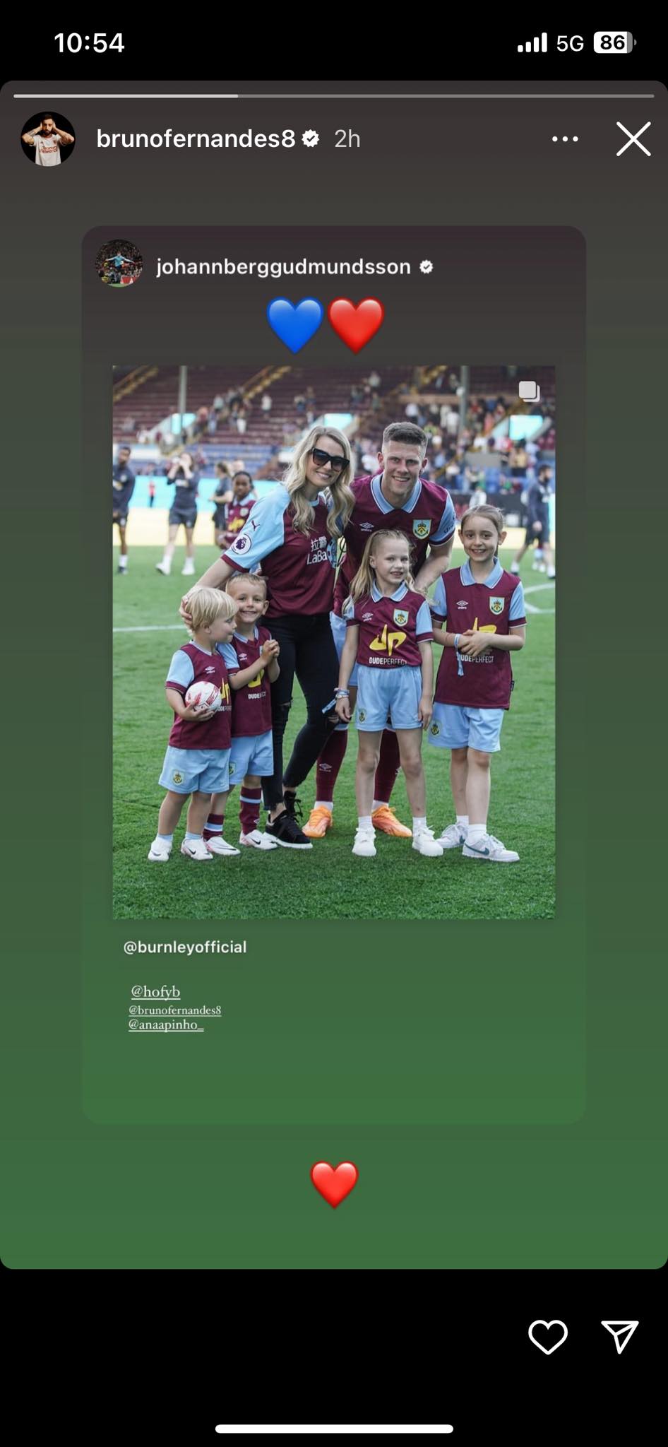Bruno Fernandes fyrirliði Manchester United sendi í gær ástarkveðju til Jóhanns Berg Guðmundssonar eftir að hann lék sinn síðasta leik fyrir Burnley á sunnudag.