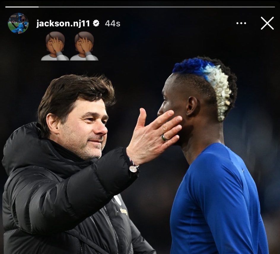 Nicolas Jackson, sóknarmaður Chelsea, virðist ansi ósáttur með að félagið hafi slitið samstarfi sínu við knattspyrnustjórann Mauricio Pochettino í gær.