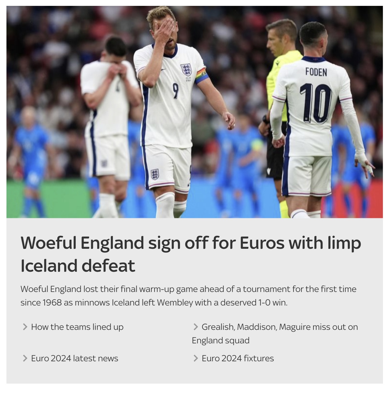 Enska liðið ætlar sér stóra hluti á EM í Þýskalandi í sumar og því ljóst að úrslit gærkvöldsins eru reiðarslag. Þess má geta að það var baulað hressilega á enska liðið í leikslok í gær.