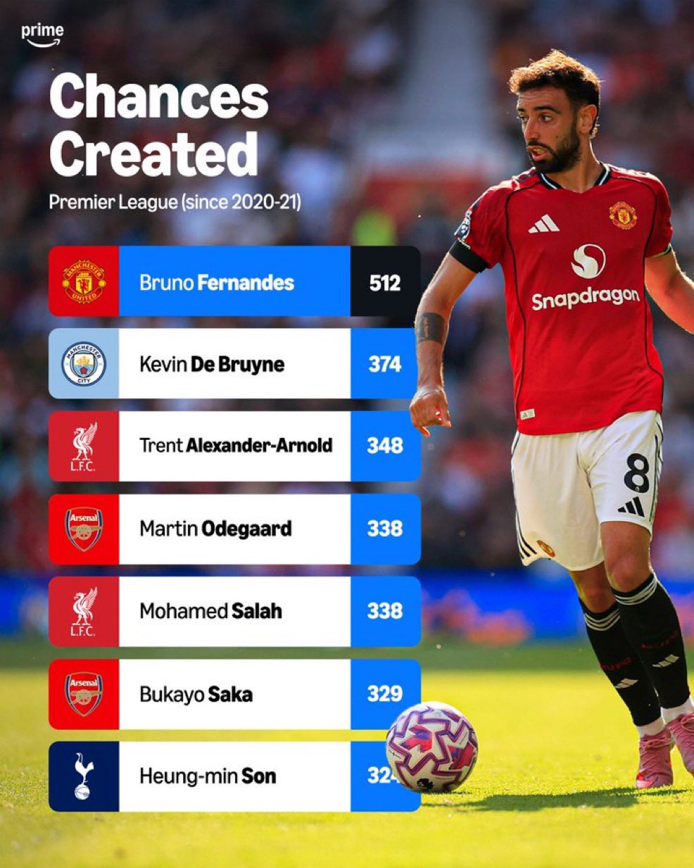 Frá árinu 2020 hefur Bruno Fernandes haft mikla yfirburði í ensku deildinni þegar kemur að því að skapa færi fyrir samherja sína.