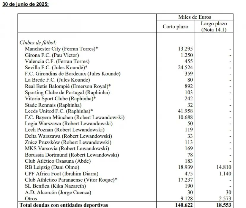 Stór hluti skuldarinnar tengist kaupum félagsins sumarið 2022, þegar Barcelona keypti Robert Lewandowski, Raphinha og Jules Koundé fyrir samanlagt 150 milljónir evra. Enn eru ógreiddar 42 milljónir evra vegna Raphinha frá Leeds, 25 milljónir vegna Koundé frá Sevilla og 10 milljónir vegna Lewandowski frá Bayern München.