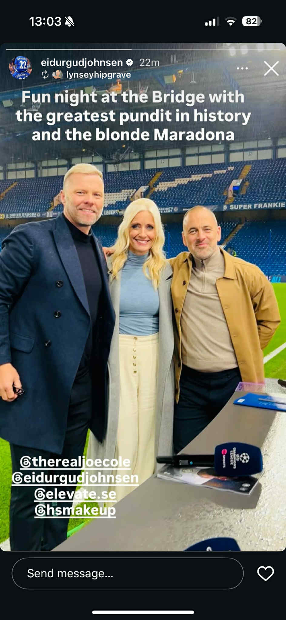„Frábært kvöld á Brúnni með besta sérfræðingi sögunnar og hinum ljóshærða Maradona,“ sagði sjónvarskonan í færslu á Instagram.