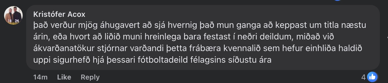 Körfuboltamaðurinn öflugi óttast að Valur muni ekki keppa um titla í kvennaflokki á næstu árum. „Það verður mjög áhugavert að sjá hvernig það mun ganga að keppast um titla næstu árin, eða hvort að liðið muni hreinlega bara festast í neðri deildum, miðað við ákvarðanatökur stjórnar varðandi þetta frábæra kvennalið sem hefur einhliða haldið uppi sigurhefð hjá þessari fótboltadeild félagsins síðustu ára,“ skrifaði Kristófer á Facebook síðu Vals.