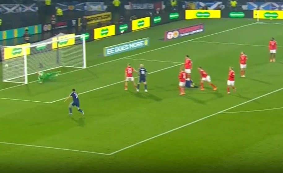 Til að gulltryggja sætið á HM í fyrsta sinn síðan 1998 skoraði Kenny McLean fyrir aftan miðju í restina þegar Kasper Schmeichel var kominn ansi framarlega.