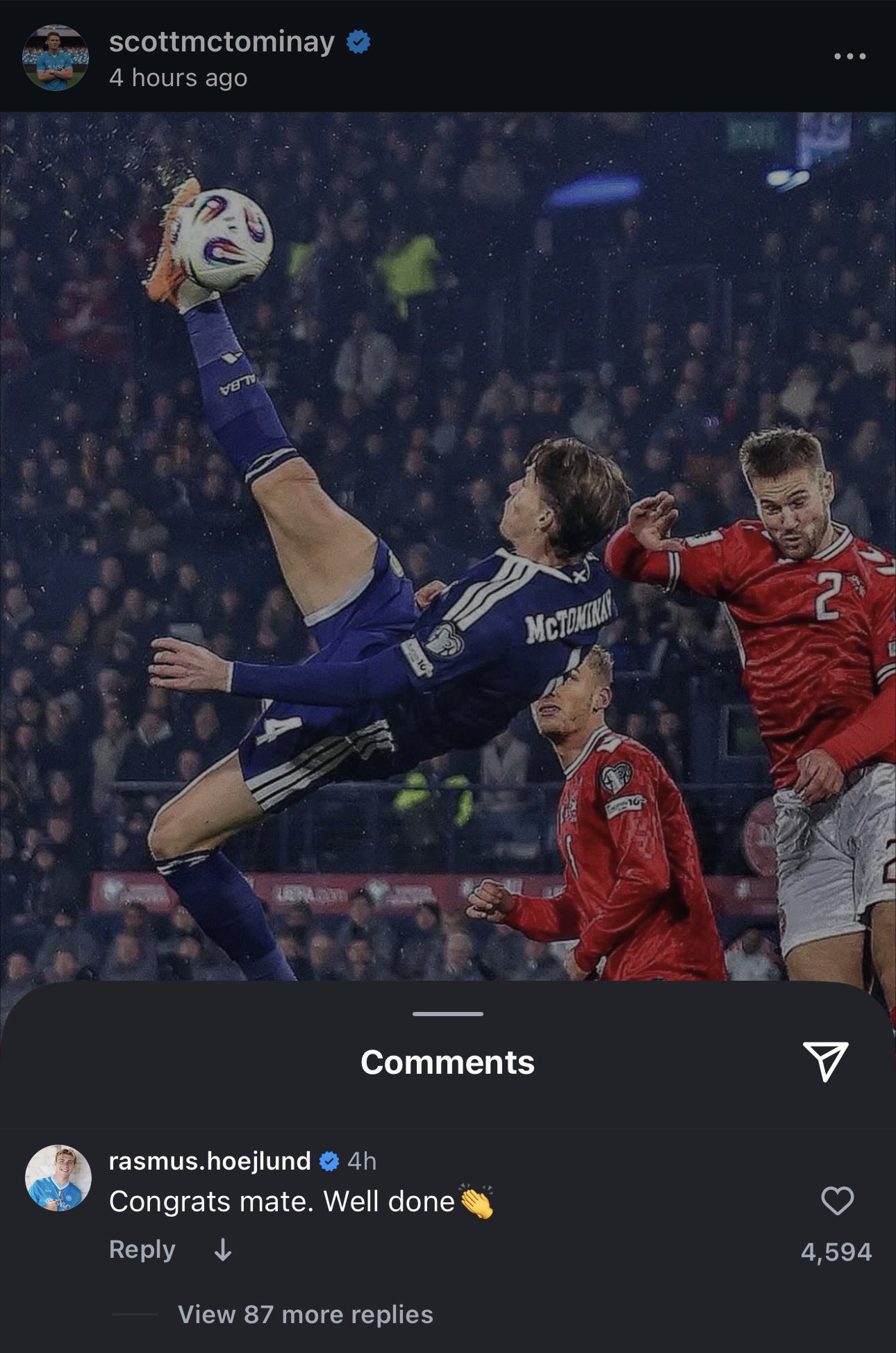 Danski landsliðsframherjinn Rasmus Hojlund hefur vakið talsverða umræðu eftir athugasemd sem hann skrifaði á Instagram hjá Scott McTominay stuttu eftir dramatískt 4-2 tap Dana gegn Skotum í undankeppni HM á Hampden Park.
