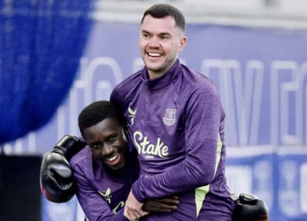 Liðsfélagarnir Idrissa Gueye og Michael Keane hjá Everton hafa greinilega sett undarlegt upphlaup þeirra á Old Trafford á bak við sig, en þeir birtust brosandi saman í skemmtilegu boxvídeói á æfingu á fimmtudag.