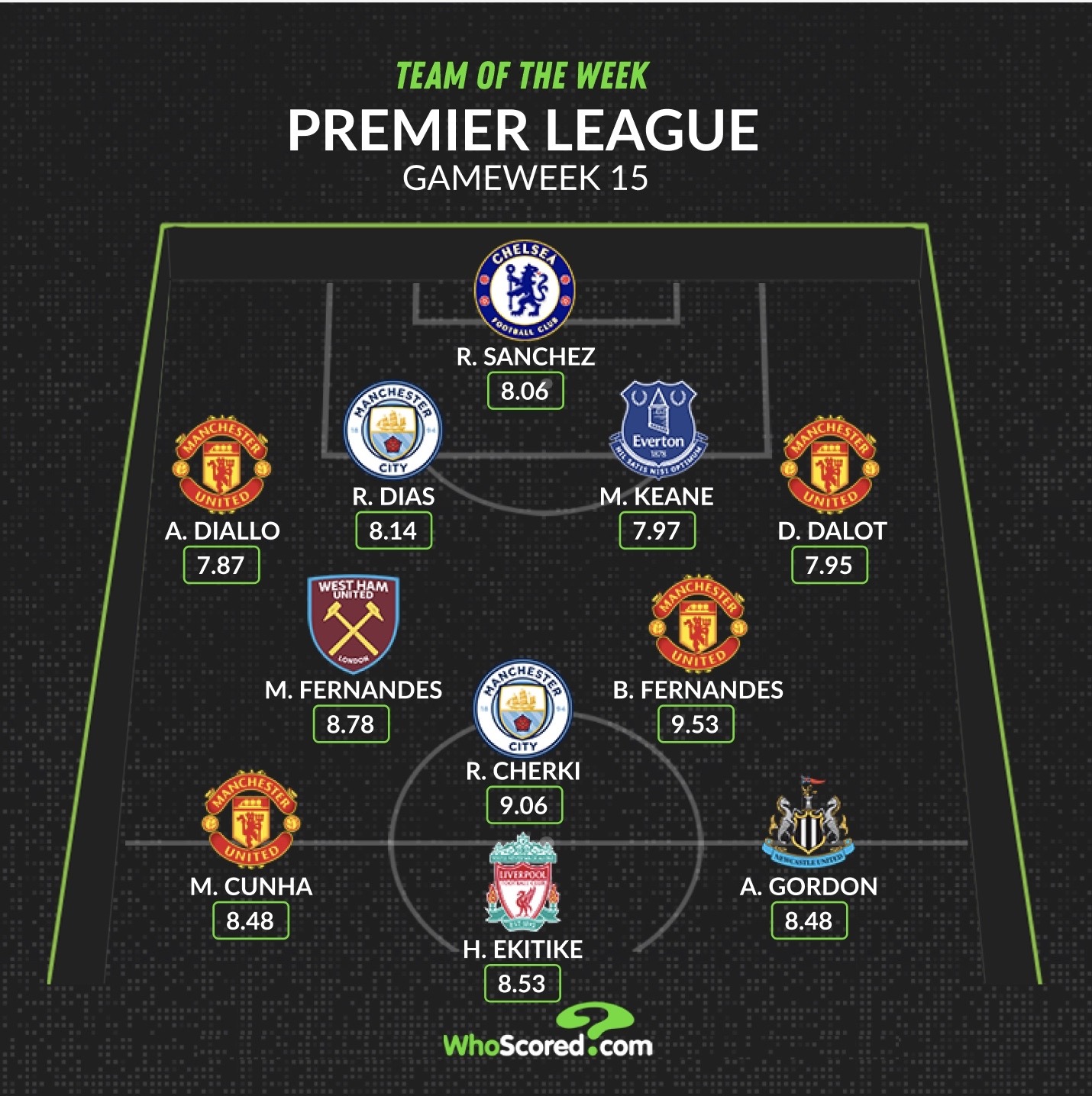 WhoScored hefur valið lið umferðarinnar í enska en þar eru fjórir leikmenn úr herbúðum Manchester United. Umferðinni lauk í gær með 1-4 sigri United á Wolves.