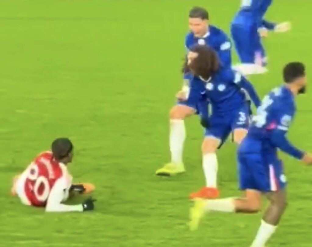 Þegar Madueke kom inn á blés leikurinn upp í enn meiri spennu. Í einu atvikinu var hann tekinn af Enzo Fernández á jaðri teigsins og féll í jörðina. Fernández og Marc Cucurella fögnuðu tæklingunni beint í andlitið á Madueke þar sem hann lá enn í grasinu.