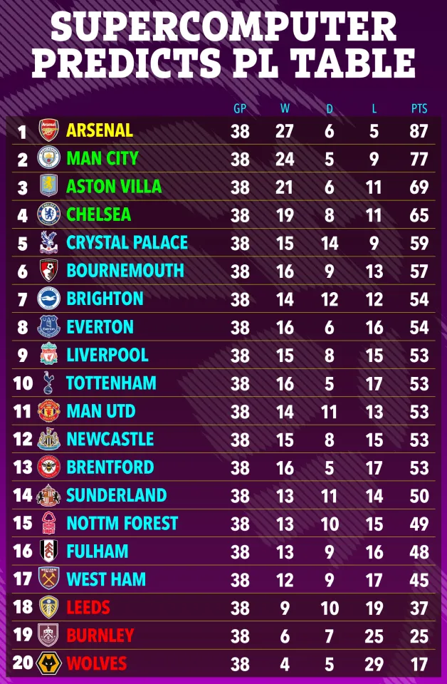 Manchester City verðu samkvæmt Ofurtölvunni í öðru sæti og Aston Villa og Chelsea fylgja þeim í Meistaradeildina.