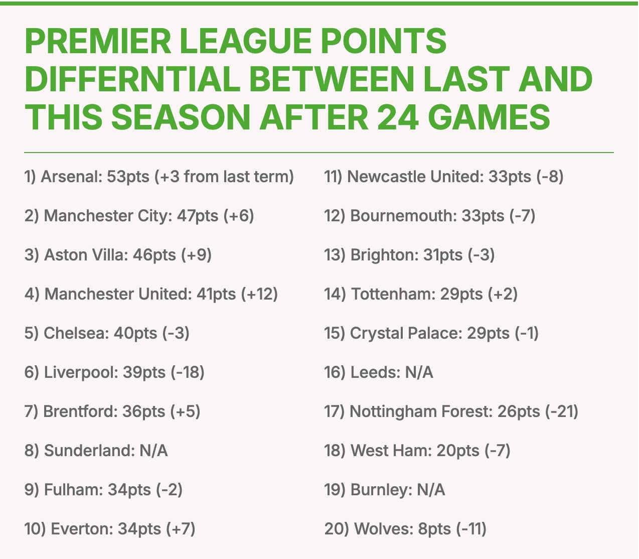 Samkvæmt tölfræði sem blaðamaður Sky Sports, Dougie Critchley, birti hefur staða margra liða breyst verulega frá sama tímapunkti í fyrra. Mest vekur athygli fall Liverpool. Fyrir ári síðan var liðið á toppnum og sjö stigum á undan Arsenal, en er nú 18 stigum verr statt. Lið Arne Slot hefur átt erfitt uppdráttar þrátt fyrir stór innkaup.
