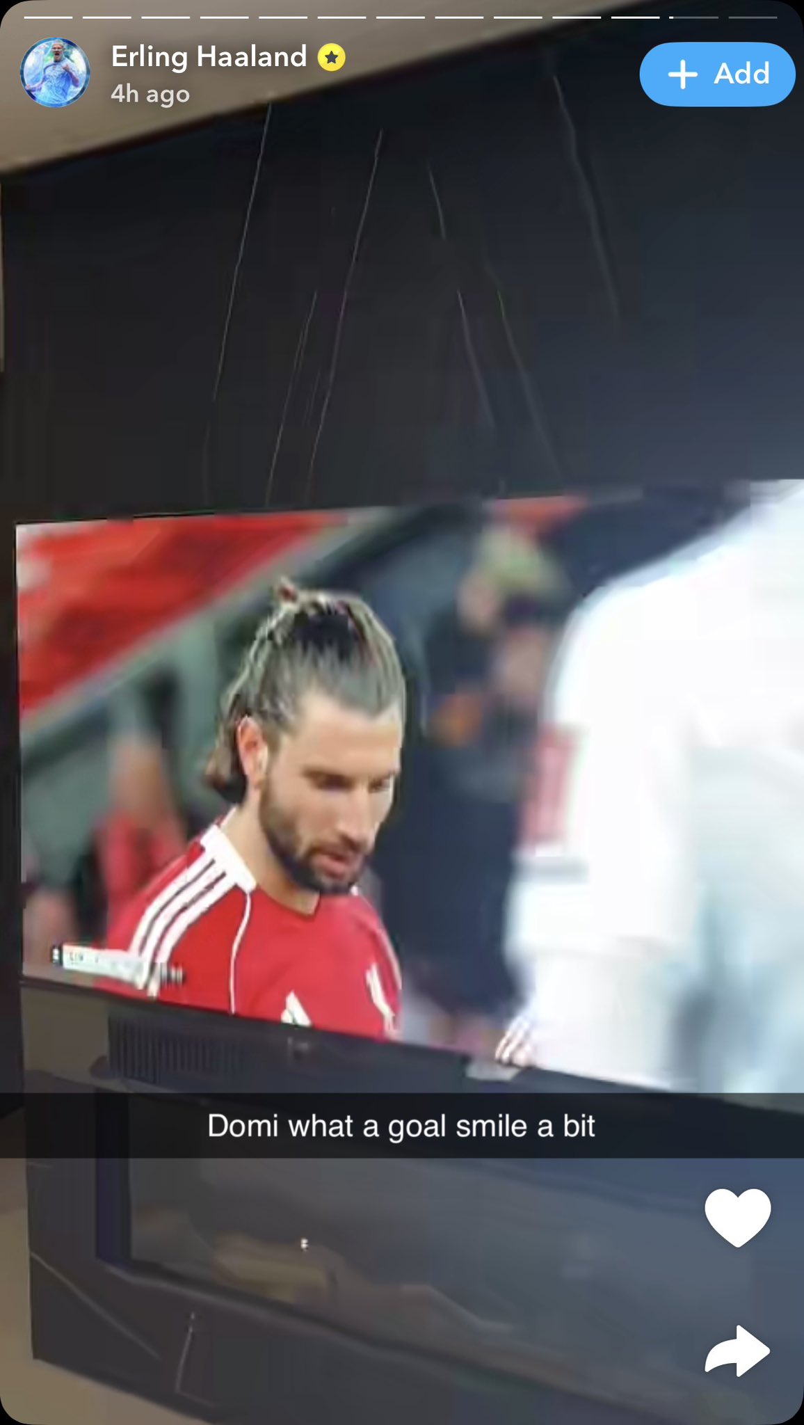 Eftir leikinn birti Haaland mynd á Snapchat þar sem hann horfði á leikinn í sjónvarpi og skrifaði: „Domi, frábært mark, brostu aðeins.“