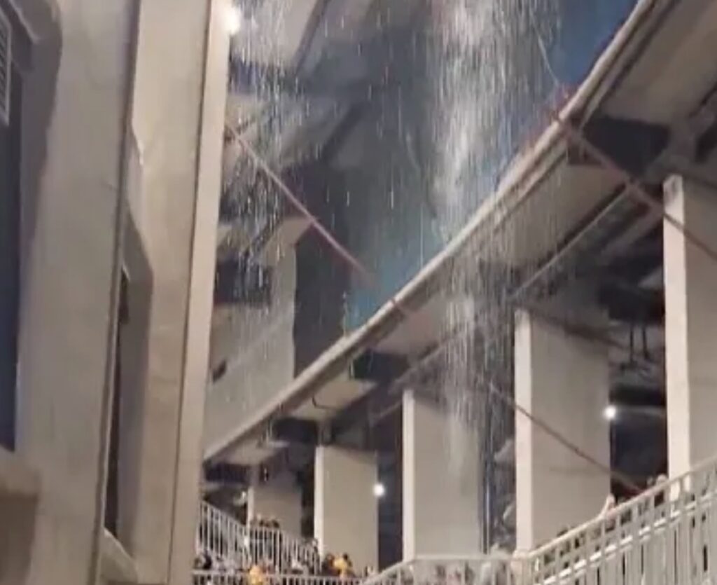 Endurnýjun hins goðsagnakennda leikvangs hefur þó ekki gengið hnökralaust. Eftir mikla rigningu um helgina streymdi vatn niður á stuðningsmenn á ákveðnum svæðum vallarins, í svipuðum atvikum og sést hafa á heimavelli Manchester United.