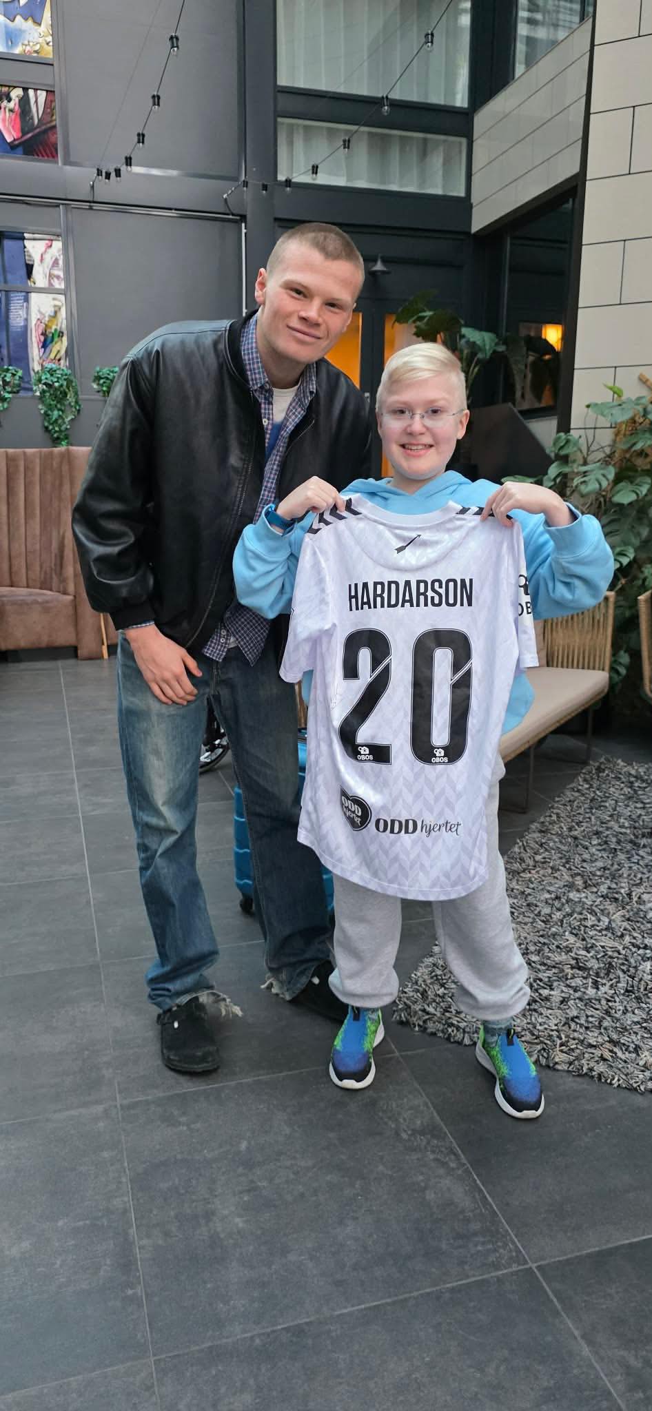 Ægir Þór Sævarsson, 14 ára, fékk áritaða Odds BK treyju frá Hinriki Harðarsyni, í gær. Hinrik gekk til liðs við félagið, sem er elsta knattspyrnufélag Noregs, í mars í fyrra.