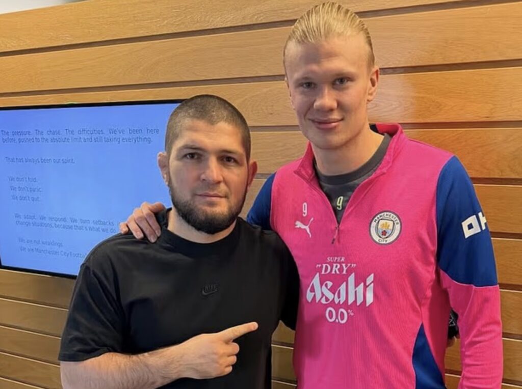 Í færslu Haalands mátti sjá skilaboð á vegg bak við hann og UFC-goðsögnina Khabib Nurmagomedov. Þar var lögð áhersla á seiglu, baráttuanda og að City gefist aldrei upp, jafnvel þegar á móti blæs.