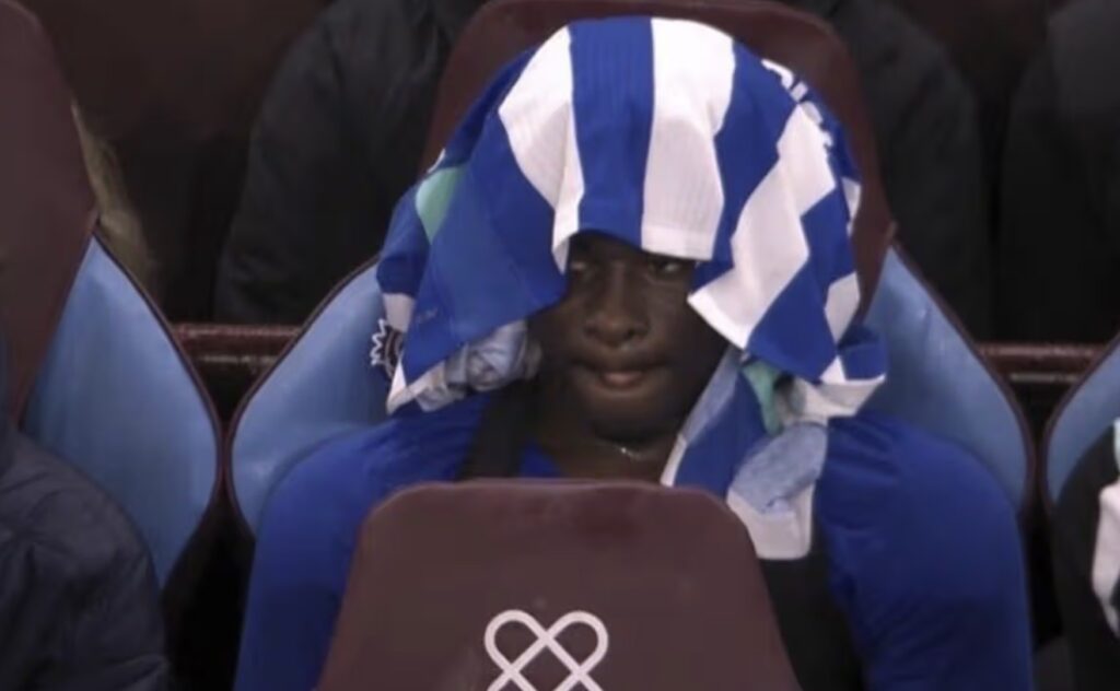 Kamerúnski miðjumaðurinn, 22 ára, var tekinn af velli strax á 22. mínútu á Villa Park. Hann fékk gult spjald eftir aðeins tvær mínútur fyrir brot á Morgan Rogers og var síðan skipt útaf fyrir James Milner. Sjónvarpsmyndavélar sýndu Baleba greinilega vonsvikinn á varamannabekknum.