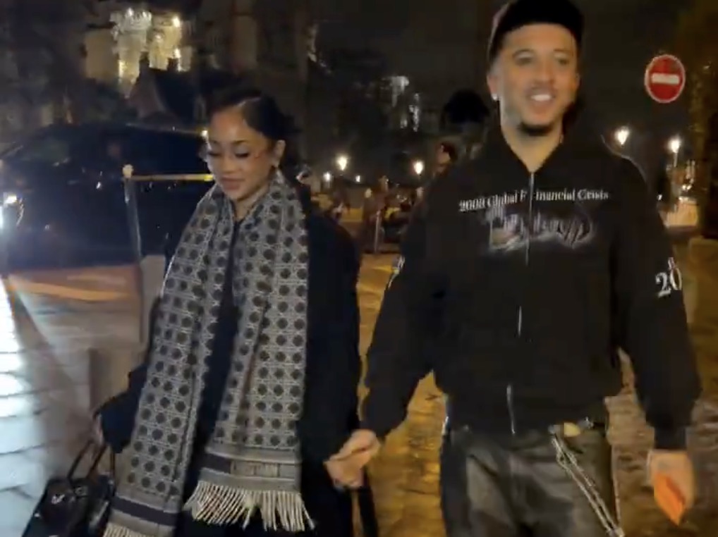 Jadon Sancho vakti athygli í París þegar hann sást haldast í hönd við kærustu sína, tónlistarkonuna Saweetie, þar sem parið mætti glæsilegt til leiks í frönsku höfuðborginni.