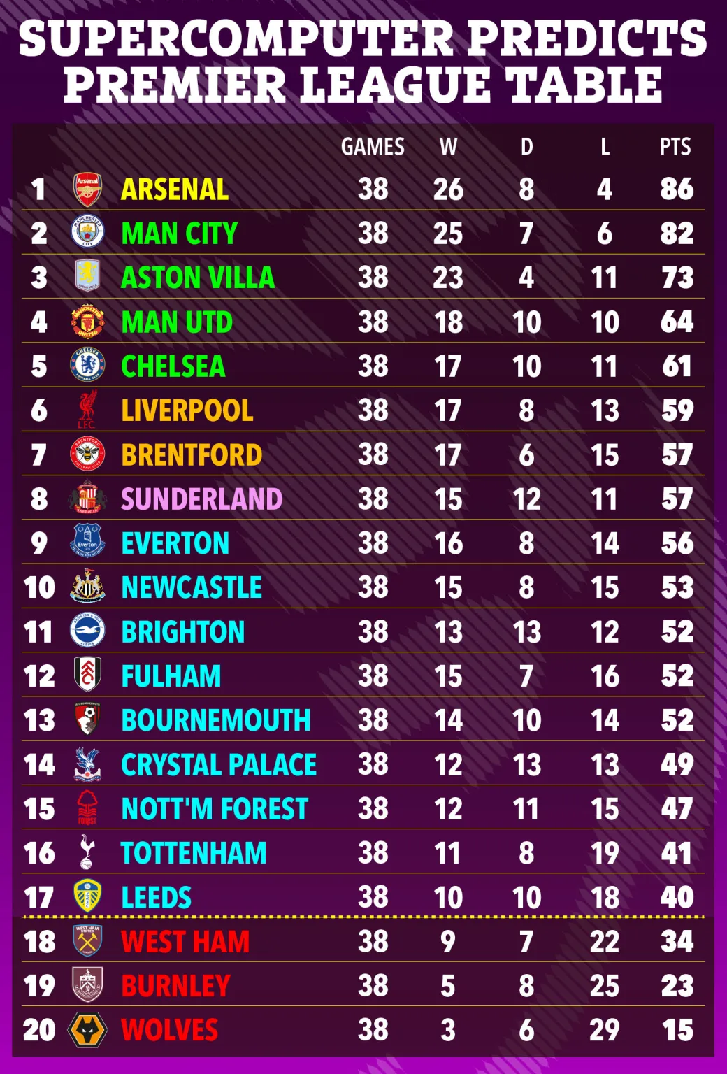 Athygli vekur að Tottenham er spáð 16. sæti, en West Ham, Burnley og Wolves falla samkvæmt Ofurtölvunni góðu.