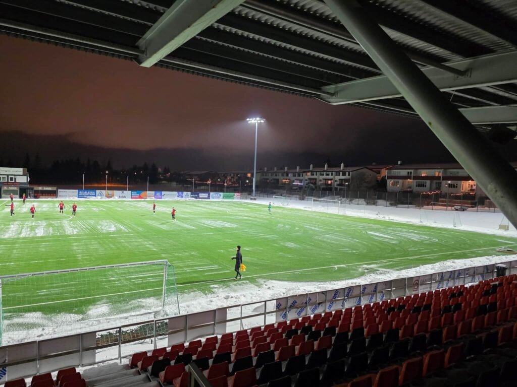 Í leikhléi rættist nokkuð úr veðrinu og völlurinn var hreinsaður af snjó.