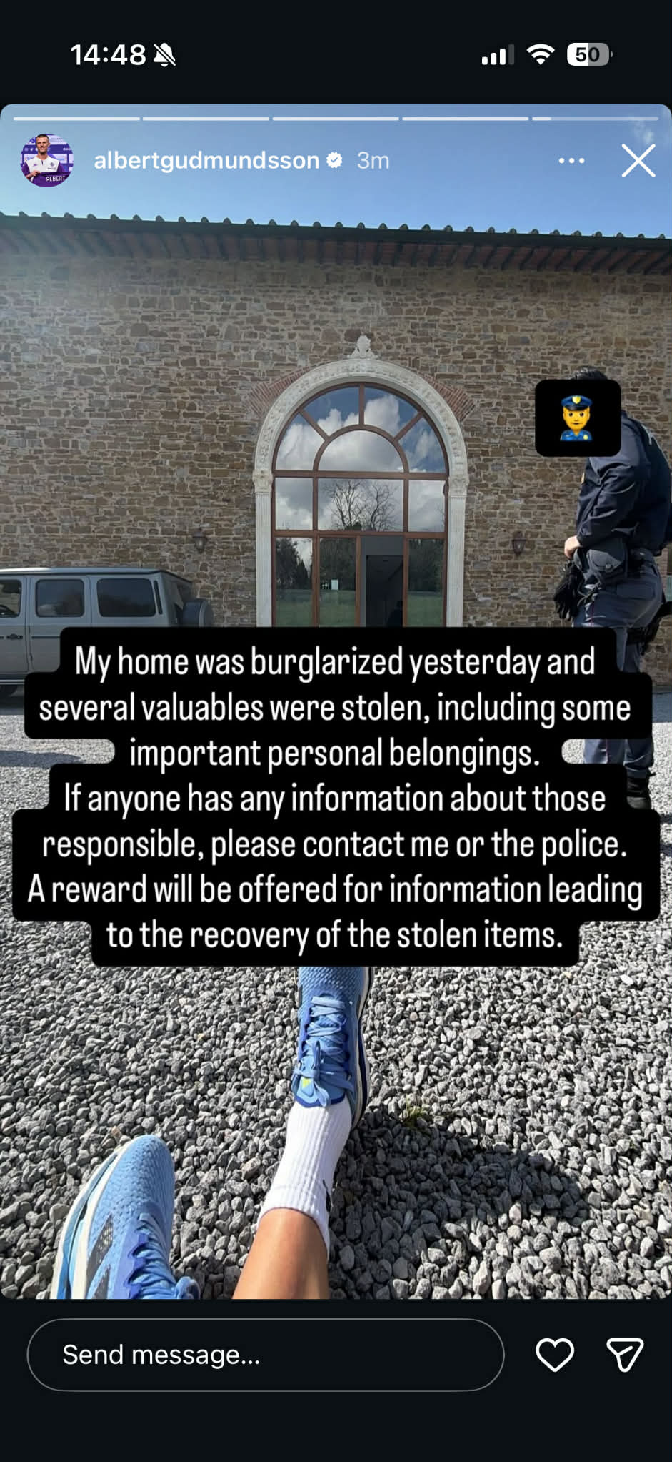 Albert Guðmundsson leikmaður íslenska landsliðsins og Fiorentina á Ítalíu segir frá því á Instagram að brotist hafi verið inn á heimili hans í gærkvöldi.