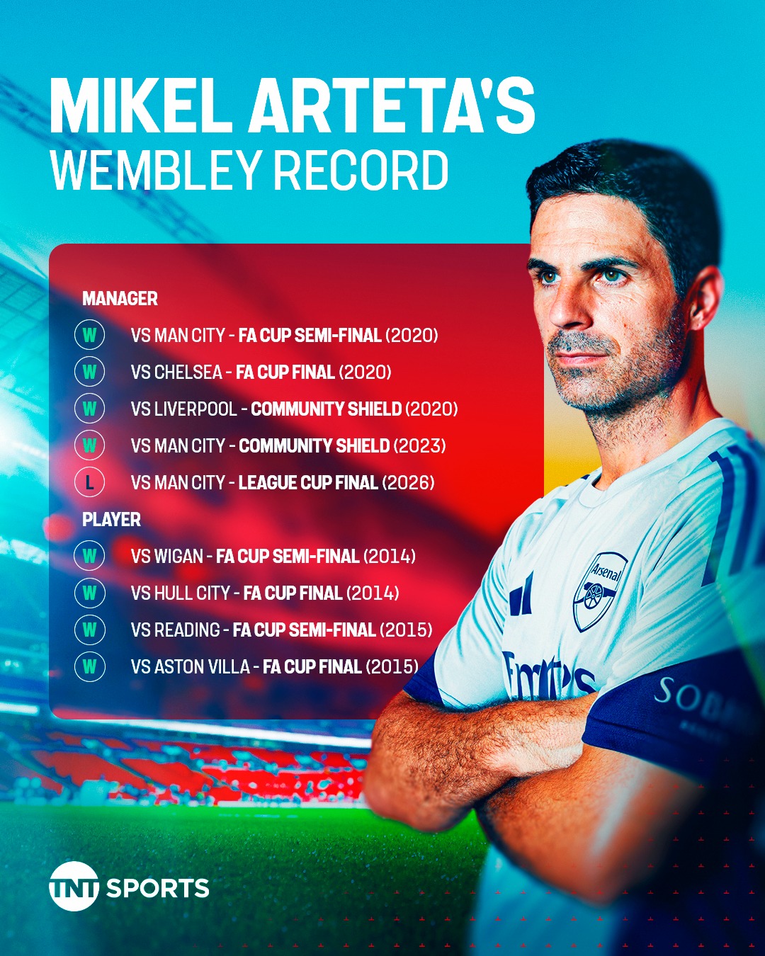 Þrátt fyrir tapið er ferill Arteta á Wembley enn afar sterkur og sýnir hversu vel honum hefur gengið í úrslitaleikjum hingað til.