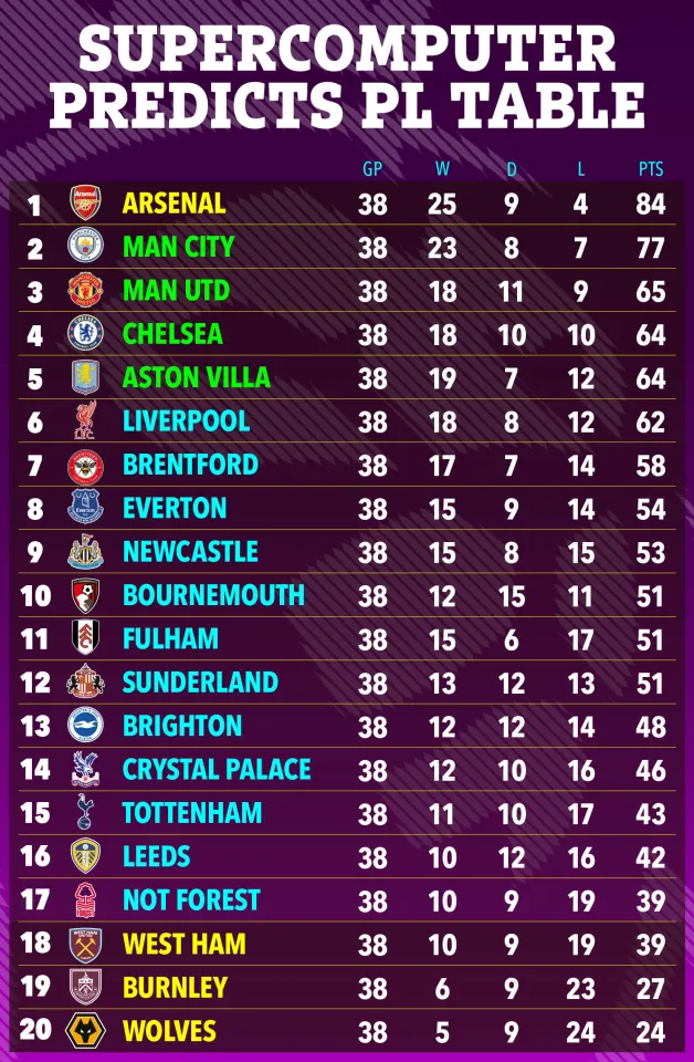 Samkvæmt spánni mun Manchester United ná þriðja sætinu og vera aðeins einu stigi á undan Chelsea. Aston Villa kemst einnig inn í topp fimm en Liverpool missir af Meistaradeildarsæti miðað við þetta.