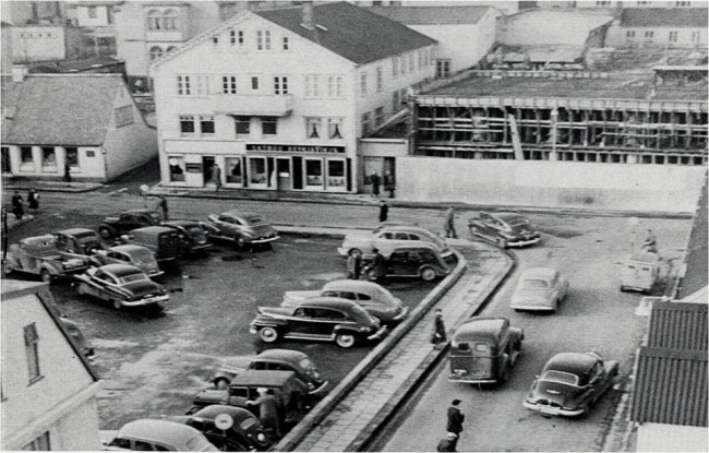 Þessi mynd er af vefnum 101Reykjavík og sýnir Aðalstræti á sjötta áratugnum, það er byrjað að byggja Moggahöllina – sem aldrei skyldi verið hafa.