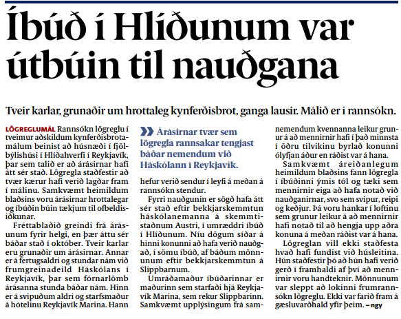 Yfirmaður á lögfræðiskrifstofu lögreglustjórans á höfuðborgarsvæðinu segir að þessi frétt sem birtist í Fréttablaðinu í morgun sé „orðum aukin“. Íbúðin hafi ekki verið „sérútbúin“. Hvernig er fréttin tilkomin og hefði verið hægt að nálgast upplýsingar hjá lögreglunni sem hefðu komið í veg fyrir birtingu hennar?