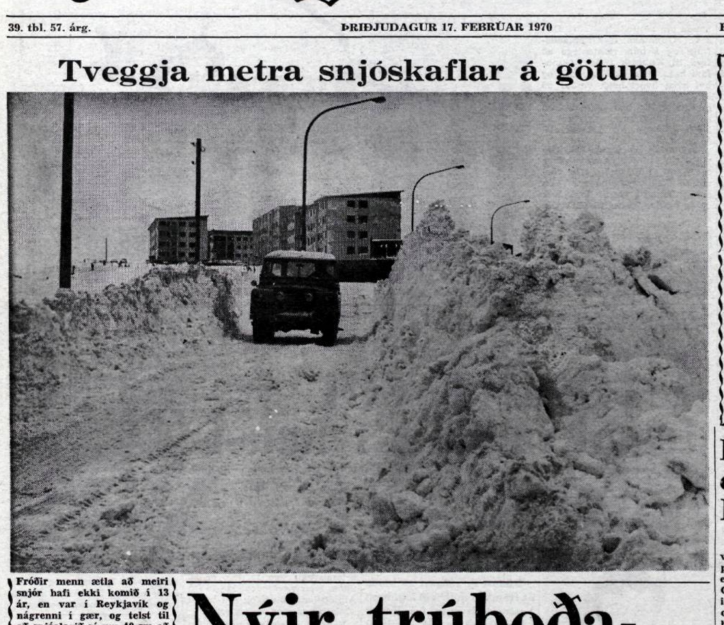 Jakob Möller hæstaréttarlögmaður var svo vinsamlegur að benda mér á að veðrið sem ég skrifaði um í pistli í gærkvöldi hefði sennilega verið 16. febrúar 1970. Þá, eins og ég lýsti, var óveður með mikilli snjó um morguninn, en upp úr tíu lægði, snjókomunni slotaði, og börn nutu skólafrís og fóru út að leika sér í fannferginu.