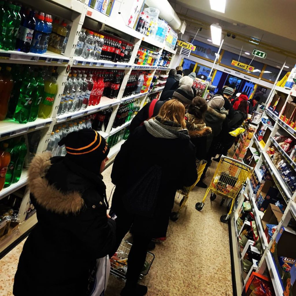 Vinkona mín Tinna birti þessa mynd á Facebook. Fólk að versla síðdegis í dag. Búðirnar fylltust allt í einu af fólki.