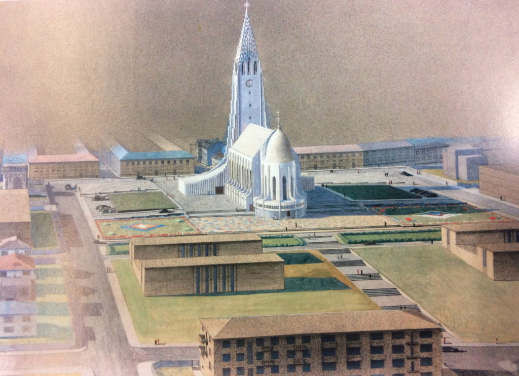 Málverk Freymóðs Jóhannssonar af fyrirhuguðum byggingum á Skólavörðuholti frá 1942. Þá var ótútleg braggabyggð á holtinu.