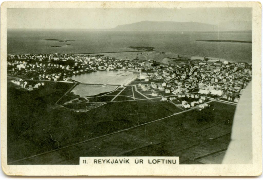 Hér er loks mynd sem er titluð Reykjavík úr loftinu. Þarna sjáum við að Örfirisey er eiginlega ekki neitt neitt og Grandinn aðeins mjó ræma þangað út. Hringbrautin er enn ekki orðin til, það er Laufásvegur sem sést lengst til hægri á myndinni en Njarðargatan er þarna eins og slóði út í Skerjafjörð. Hvítu stórbyggingarnar sem eru þarna við Laufásveginn eru svokallaðar Sturluhallir. Þetta eru risastór einbýlishús með stórum görðum sem bræðurnir Sturla og Friðrik Jónsson reistu sér á árunum 1922 til 1924. Arkitektinn var Einar Erlendsson sem varð síðar húsameistari ríkisins. Á Laufásvegi 51 hefur lengi verið leikskólinn Laufásborg, en á Laufásvegi 49 var breska sendiráðið til húsa. Þar urðu óeirðir vegna landhelgisdeilunnar 1973 og voru flestar rúður í húsinu brotnar. Nú starfar þarna Íslenska auglýsingastofan.