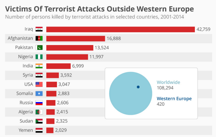 Svo er merkilegt að bera þessa tölfræði saman við þetta súlurit sem er líka frá Statista og sýnir mannfall vegna hryðjuverka í heiminum annars staðar en í Vestur-Evrópu á árunum 2001-2014. Samkvæmt þessu, tölurnar koma frá Global Terrorism Database, er „staðan“ 108.294 gegn 420.