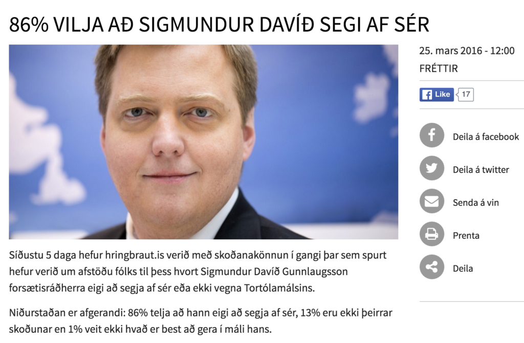 En það væri reyndar mjög forvitnilegt að sjá alvöru skoðanakönnun um þetta mál. Maður hefur á tilfinningunni að staða Sigmundar hafi veikst fremur en hitt. Það er veikleikamerki að fara í uppstrílað viðtal í Fréttablaðinu og á jaðarstöðina Útvarp Sögu til að svara fyrir jafn stórt og erfitt mál og öll þessi Tortólauppákoma er. Svörin hafa heldur ekki verið sannfærandi.