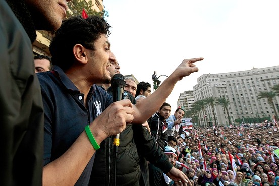 Wael Ghonim á Tahrir torgi í Kaíró 2011. Hann segir að samskiptamiðlar hafi fylkt mótmælendum saman en sundrað þeim fljótt aftur.