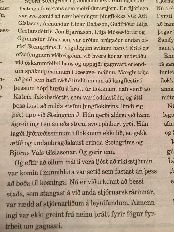 Davíð finnur Katrínu allt til foráttu. Hún er vænd um hatur á stjórnarskrá Íslands og henni er borið á brýn að vera leppur Steingríms J. Sigfússonar og Björns Vals Gíslasonar. Hún gangi erinda þeirra í stóru og smáu. Markmiðið sé að koma Katrínu í lykilstöðu svo Steingrímur komist aftur til valda. Og auðvitað er Icesave nefnt – hvað annað?