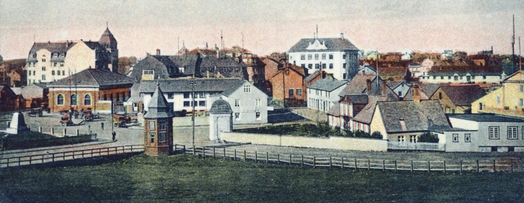 Hér er póstkort útgefið af Agli Jacobsen og versluninni Birni Kristjánssyni og sent til Berlínar 1925. Myndin er tekin frá Arnarhóli, segir á síðu sem nefnist Svipmyndir úr fortíðinni en þar birtist myndin. Það er skemmtilegt hvernig hún hefur verið lituð.