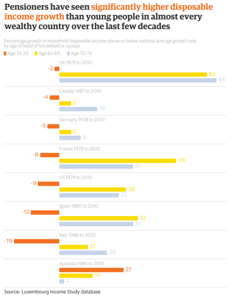 Guardian birtir meðfylgjandi súlurit um tekjuþróun mismunandi aldurshópa í ýmsum löndum.