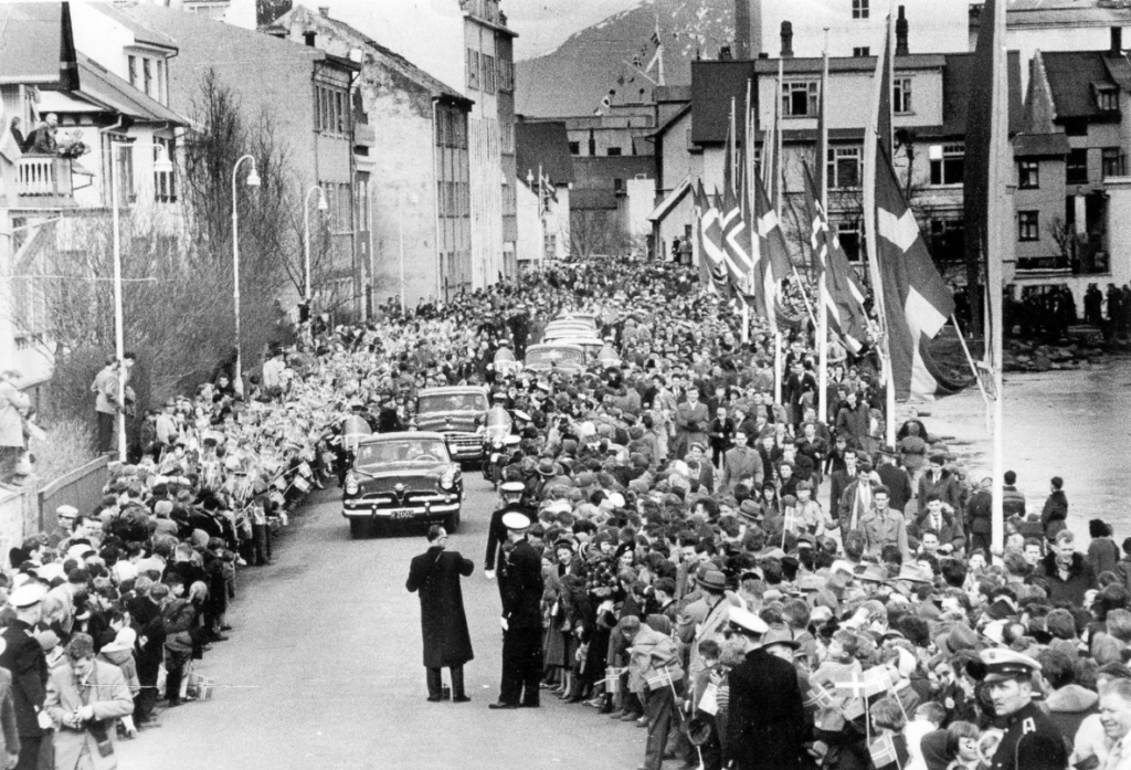 Ólafur Thors forsætisráðherra heilsar Ólafi Noregskonungi niðri við höfn. Þarna er líka Ásgeir Ásgeirsson forseti og Guðmundur Í. Guðmundsson utanríkisráðherra.