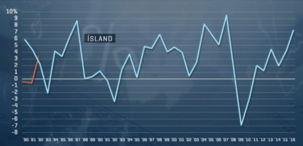 Rúv birti þetta línurit sem sýnir hagvöxt á Íslandi síðan 1980.