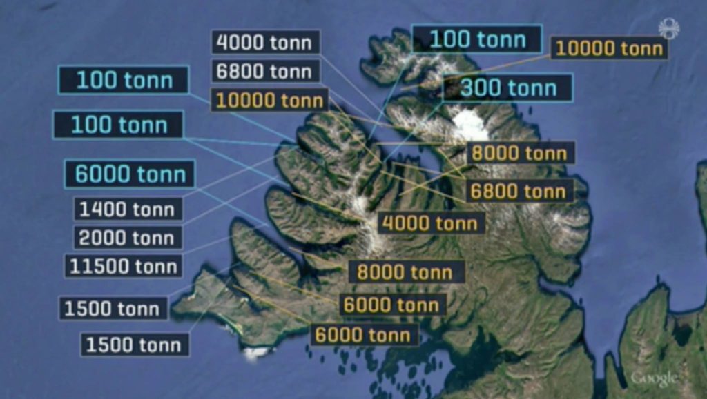 En fyrir austan var framleiðslan 1500 tonn í fyrra, en hún mun margfaldast eins og sjá má á myndinni. Þetta eru ótrúleg inngrip í náttúruna og merkilegt að ekki skuli vera meiri umræða um þessi áform, en í Noregi hafa verið margvísleg vandræði vegna fiskeldis í fjörðum.