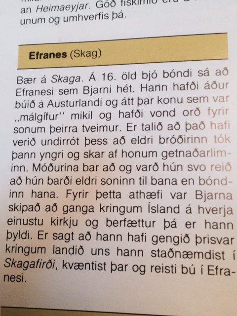 Eins og til dæmis þessu litla broti um bæinn Efranes á Skaga. Þarna er sögð mikil saga í mjög fáum línum. Má með sönnu segja að þetta sé harðsoðin frásögn. En dramatíkina vantar ekki. Maður veit svo ekki alveg hvort maður á að trúa þessu.