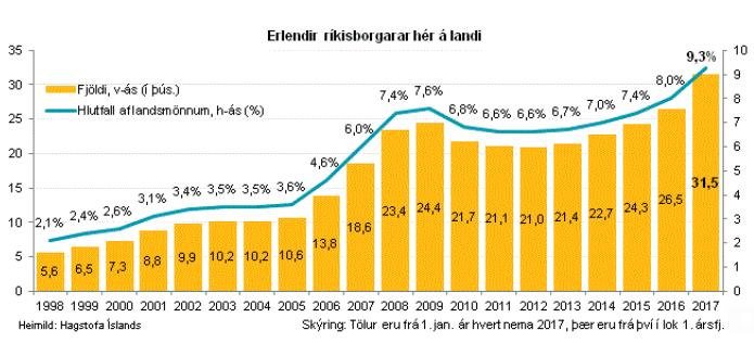 Hér er graf sem birtir fjölda erlendra ríkisborgara hér á landi.